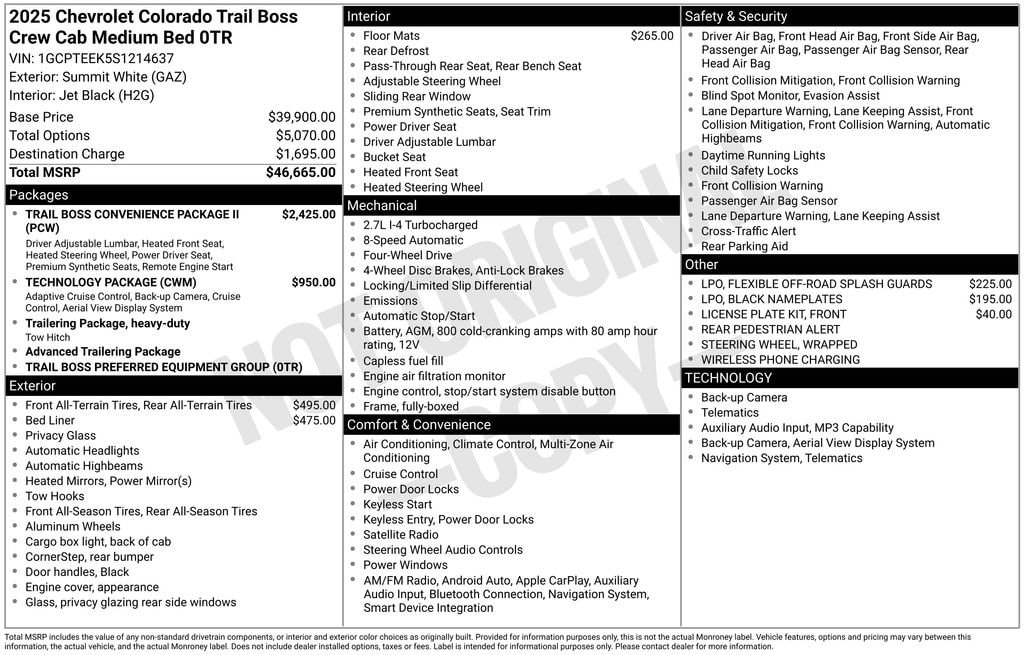 Certified. Summit White 2025 Chevrolet Colorado Trail Boss 4WD 8-Speed Automatic 2.7L I4 Turbocharged DOHC 16V LEV3-ULEV50 310hp 4WD.Recent Arrival!Check out our 5 Star Google Reviews! Drive a little save a lot. Sale Price Includes $1,000 Finance Savings. Contact Dealer For Details.