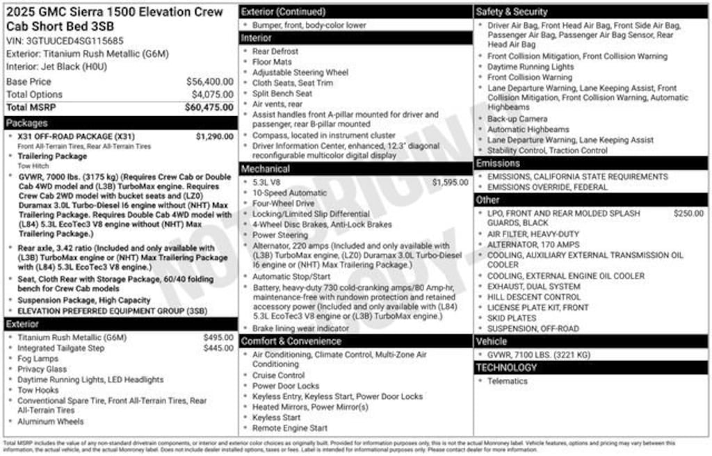 Take your drives to the next level with this GMC Sierra 1500 from Salt Lake Valley Buick GMC! Engineered for a smooth ride, advanced convenience, and lasting dependability, this vehicle is ready to handle everything your day throws at you. Plus, enjoy a $1,000 finance savings, already included in the sale price, when you finance through one of our trusted lending partners. Looking for quality used cars in Salt Lake City? This GMC Sierra 1500 delivers style, versatility, and value - perfect for daily commutes, family trips, or weekend adventures. Stop by Salt Lake Valley Buick GMC to see this vehicle in person and explore our wide selection of pre-owned cars, trucks, and SUVs. Browse online at www.slvbuickgmc.com or call 801-265-1511 to schedule your test drive today! With Cloth Rear Seat w/Storage Package, High Capacity Suspension Package, Preferred Equipment Group 3SB (120-Volt Bed Mounted Power Outlet, 120-Volt Interior Power Outlet, 2 Charge/Data USB Ports, 2 Type-C Charge-Only Rear USB Ports, 6-Speaker Audio System Feature, Auto-Locking Rear Differential, Body Color Header w/Gloss Black Mesh Grille Bars, Color-Keyed Carpeting Floor Covering, Deep-Tinted Glass, Electric Rear-Window Defogger, Front Frame-Mounted Black Recovery Hooks, Front Rubberized-Vinyl Floor Mats, HD Rear Vision Camera, Integrated Trailer Brake Controller, Keyless Open & Start, LED Cargo Area Lighting, Manual Tilt-Wheel & Telescoping Steering Column, OnStar Services Capable, Power Door Locks, Power Front Windows w/Driver Express Up/Down, Power Front Windows w/Passenger Express Down, Power Rear Windows w/Express Down, Push Button Start, Rear Rubberized-Vinyl Floor Mats, Remote Vehicle Starter System, SiriusXM w/360L Trial Subscription, Steering Wheel Audio Controls, Theft Deterrent System (Unauthorized Entry), and Wi-Fi Hotspot Capable), Trailering Package (Hitch Guidance), X31 Off-Road Package (Dual Exhaust System, Heavy-Duty Air Filter, Hill Descent Control, Off-Road Suspension, Rear Wheelhouse Liners, and X31 Hard Badge), 10-Way Power Driver Seat Adjuster w/Lumbar, 170 Amp Alternator, 220 Amp Alternator, 4-Way Manual Passenger Seat Adjuster, 4-Wheel Disc Brakes, 6 Speakers, ABS brakes, Air Conditioning, Alloy wheels, AM/FM radio: SiriusXM with 360L, Apple CarPlay/Android Auto, Auto High-beam Headlights, Automatic Emergency Braking, Automatic temperature control, Auxiliary External Transmission Oil Cooler, Brake assist, Buckle to Drive, Bumpers: body-color, Cloth Seat Trim, Compass, Delay-off headlights, Driver door bin, Driver vanity mirror, Dual front impact airbags, Dual front side impact airbags, Electronic Stability Control, Emergency communication system: OnStar, External Engine Oil Cooling, Following Distance Indicator, Forward Collision Alert, Front & Rear Black Molded Splash Guards (LPO), Front 40/20/40 Split-Bench Seat, Front anti-roll bar, Front Center Armrest w/Storage, Front dual zone A/C, Front fog lights, Front License Plate Kit, Front Pedestrian Braking, Front reading lights, Front wheel independent suspension, Fully automatic headlights, Genuine wood dashboard insert, GMC MultiPro Tailgate, Heated door mirrors, Heated Driver & Front Outboard Passenger Seating, Heated front seats, Heated steering wheel, Illuminated entry, IntelliBeam Automatic High Beam On/Off, Lane Keep Assist w/Lane Departure Warning, Low tire pressure warning, Navigation System, Occupant sensing airbag, Outside temperature display, Overhead airbag, Overhead console, Panic alarm, Passenger door bin, Passenger vanity mirror, Power door mirrors, Power driver seat, Power steering, Power windows, Radio data system, Radio: Premium GMC Infotainment Audio System, Rear reading lights, Rear seat center armrest, Rear step bumper, Rear window defroster, Remote keyless entry, Security system, Speed control, Speed-sensing steering, Split folding rear seat, Steering wheel mounted audio controls, Tachometer, Telescoping steering wheel, Tilt steering wheel, Traction control, Trip comp