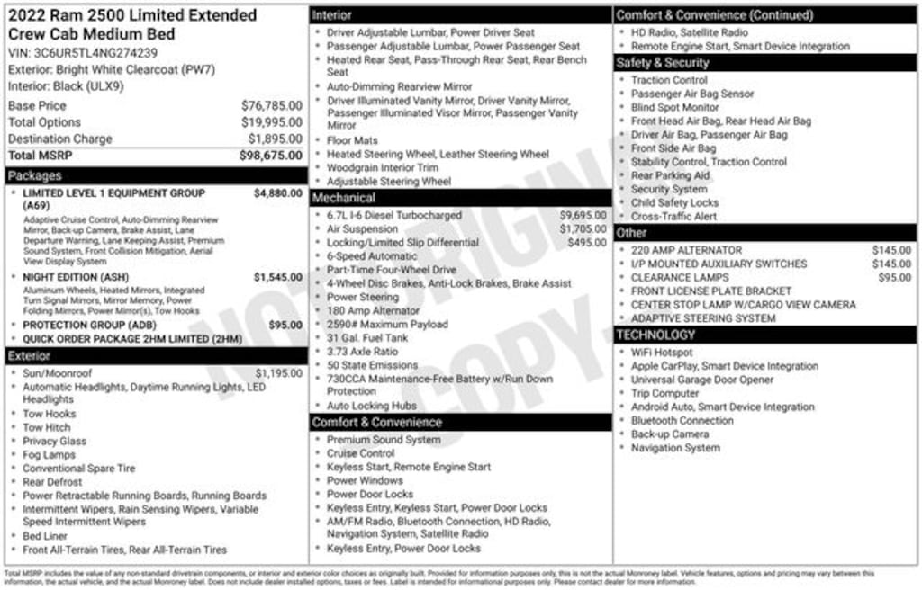 Get ready to hit the road in this Ram 2500, a standout choice for drivers looking for reliability, performance, and style! This impressive vehicle is packed with premium features designed to make every drive more enjoyable. Plus, youâll enjoy a $1,000 finance savings, already included in the sale price, when you finance through one of our trusted lending partners. Whether youâre searching for used cars in Salt Lake City, a dependable SUV, or a powerful truck, this Ram 2500 delivers everything you need and more. Visit Salt Lake Valley Chrysler Dodge Jeep Ram today to test drive or explore our entire selection of quality pre-owned vehicles. Donât wait - shop online at www.slvcdjr.com or call 801-484-8755 to learn more! This amazing vehicle comes loaded with options like Limited Level 1 Equipment Group (17 Speaker harman kardon Premium Sound, Adaptive Cruise Control w/Stop, Adaptive Steering System, Center Stop Lamp w/Cargo View Camera, Digital Rearview Mirror, Full Speed Forward Collision Warning Plus, Lane Keep Assist, Surround View Camera System, and Trailer Reverse Guidance), Night Edition (Black Exterior Mirrors, Black Exterior Truck Badging, Black Headlamp Bezels, Black Limited Grille, Black RAM Head Tailgate Badge, Black Tail Lamp Bezels, Black Wheel Center Hub, Body Color Door Handles, Body Color Grille Surround, Exterior Mirrors Courtesy Lamps, Exterior Mirrors w/Heating Element, Exterior Mirrors w/Memory, Exterior Mirrors w/Supplemental Signals, Mirror Running Lights, Mirror-Mounted Aux Reverse Lamps, Painted Front Bumper, Painted Rear Bumper, Power Adjustable Convex Aux Mirrors, Power-Folding Mirrors, Pwr Convenience Black Tow Mirrors w/Spotter & Memory, Tow Hooks, Trailer Tow Mirrors, and Wheels: 20" x 8.0" Cast Aluminum Black), Protection Group, Quick Order Package 2HM Limited, 10 Speakers, 12" Touchscreen Display, 220 Amp Alternator, 3.73 Axle Ratio, 4-Wheel Disc Brakes, 4G LTE Wi-Fi Hot Spot, ABS brakes, Active Noise Control System, Adjustable pedals, Air Conditioning, Air Suspension Decal, Alloy wheels, AM/FM radio: SiriusXM with 360L, Anti-Spin Differential Rear Axle, Apple CarPlay, Apple CarPlay/Android Auto, Audio memory, Auto High-beam Headlights, Auto Level Rear Air Suspension, Auto-dimming Rear-View mirror, Automatic temperature control, Bodyside moldings, Brake assist, Bumpers: chrome, Clearance Lamps, Compass, Connected Travel & Traffic Services, Connectivity - US/Canada, Dash Pass Thru Wire Circuits, Delay-off headlights, Disassociated Touchscreen Display, Driver door bin, Driver vanity mirror, Dual front impact airbags, Dual front side impact airbags, Electronic Stability Control, Electronically Controlled Throttle, Front anti-roll bar, Front Bucket Seats, Front Center Armrest w/Storage, Front dual zone A/C, Front fog lights, Front License Plate Bracket, Front reading lights, Fully automatic headlights, Garage door transmitter, Genuine wood console insert, Genuine wood dashboard insert, Genuine wood door panel insert, Global Telematics Box Module (TBM), Google Android Auto, GPS Antenna Input, GPS Navigation, HD Radio, Heated door mirrors, Heated front seats, Heated rear seats, Heated steering wheel, I/P Mounted Auxiliary Switches, Illuminated entry, Integrated Voice Command w/Bluetooth, Leather steering wheel, Limited Leather Bucket Seats, Low tire pressure warning, Memory seat, Navigation System, Occupant sensing airbag, Off-Road Information Pages, Outside temperature display, Overhead airbag, Overhead console, Panic alarm, ParkView Rear Back-Up Camera, Passenger door bin, Passenger vanity mirror, Pedal memory, Power door mirrors, Power driver seat, Power passenger seat, Power steering, Power Sunroof, Power windows, Radio data system, Radio: Uconnect 5 Nav w/12.0" Display, Rain sensing wipers, Rear anti-roll bar, Rear reading lights, Rear seat center armrest, Rear step bumper, Rear window defroster, Remote keyless entry, Security system, Selectable Tire Fill Alert, SiriusXM w/360L, Speed control,