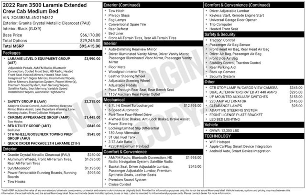Get ready to hit the road in this Ram 3500, a standout choice for drivers looking for reliability, performance, and style! This impressive vehicle is packed with premium features designed to make every drive more enjoyable. Plus, youâll enjoy a $1,000 finance savings, already included in the sale price, when you finance through one of our trusted lending partners. Whether youâre searching for used cars in Salt Lake City, a dependable SUV, or a powerful truck, this Ram 3500 delivers everything you need and more. Visit Salt Lake Valley Chrysler Dodge Jeep Ram today to test drive or explore our entire selection of quality pre-owned vehicles. Donât wait - shop online at www.slvcdjr.com or call 801-484-8755 to learn more! This amazing vehicle comes loaded with options like Bed Utility Group (LED Bed Lighting, MOPAR Deployable Bed Step, and MOPAR Spray In Bedliner), Chrome Appearance Group (Chrome Belt Moldings and Chrome Tow Hooks), Laramie Level D Equipment Group (DISC) (17 Speaker harman kardon Premium Sound, 4G LTE Wi-Fi Hot Spot, 8.4" Touchscreen Display, Alexa Built-In, All R1 High Radios, All Radio Equipped Vehicles, Apple CarPlay, Auto High Beam Headlamp Control, Connected Travel & Traffic Services, Connectivity - US/Canada, Disassociated Touchscreen Display, Exterior Mirrors w/Memory, Foam Bottle Insert (Door Trim Panel), For Details Visit DriveUconnect.com, For More Info, Call 800-643-2112, Global Telematics Box Module (TBM), Google Android Auto, GPS Antenna Input, GPS Navigation, HD Radio, Heated Second Row Seats, Integrated Center Stack Radio, Integrated Voice Command w/Bluetooth, Mirror-Mounted Aux Reverse Lamps, Off-Road Information Pages, Power Adjustable Pedals w/Memory, Power Multi-Function Manual Folding Mirrors, Radio: Uconnect 5 Nav w/8.4" Display, Radio/Driver Seat/Mirrors/Pedals Memory, Rain Sensitive Windshield Wipers, Remote Tailgate Release, Selectable Tire Fill Alert, SiriusXM Radio Service, SiriusXM w/360L, and Ventilated Front Seats), Quick Order Package 21H Laramie, Safety Group B (Adaptive Cruise Control w/Stop, Adaptive Steering System, Digital Rearview Mirror, Full Speed Forward Collision Warning Plus, and Lane Keep Assist), #1 Seat Foam Cushion, 10 Speakers, 115V Auxiliary Rear Power Outlet, 12" Touchscreen Display, 2 Way Rear Headrest Seat, 20" x 8" Polished Aluminum Wheels, 220 Amp Alternator, 3.73 Axle Ratio, 4 Way Front Headrests, 4-Wheel Disc Brakes, 5th Wheel/Gooseneck Towing Prep Group, ABS brakes, Active Noise Control System, Adjustable pedals, Air Conditioning, Alloy wheels, AM/FM radio: SiriusXM, Apple CarPlay/Android Auto, Auto-dimming Rear-View mirror, Automatic temperature control, Brake assist, Bumpers: chrome, Center Hub, Clearance Lamps, Compass, CTR Stop Lamp w/Cargo View Camera, Dash Pass Thru Wire Circuits, Delay-off headlights, Driver door bin, Driver vanity mirror, Dual Alternators Rated At 440 Amps, Dual front impact airbags, Dual front side impact airbags, Electronic Stability Control, Electronically Controlled Throttle, Front anti-roll bar, Front Bumper Sight Shields, Front Center Armrest w/Storage, Front dual zone A/C, Front fog lights, Front License Plate Bracket, Front reading lights, Front Seat Back Map Pockets, Fully automatic headlights, Garage door transmitter, Heated door mirrors, Heated Front Seats, Heated front seats, Heated Steering Wheel, Heated steering wheel, High Back Seats, I/P Mounted Auxiliary Switches, Illuminated entry, Leather steering wheel, Leather Trim 40/20/40 Bench Seat, Low tire pressure warning, Occupant sensing airbag, Outside temperature display, Overhead airbag, Overhead console, Panic alarm, ParkView Rear Back-Up Camera, Passenger door bin, Passenger vanity mirror, Power 8-Way Adjustable Passenger Seat, Power Adjust 8-Way Driver Seat, Power Deployable Running Boards, Power door mirrors, Power driver seat, Power passenger seat, Power steering, Power Sunroof, Power windows, Radio data system, Radio: Uconnect 5 Nav w/12.0" Display, Radio: Uco