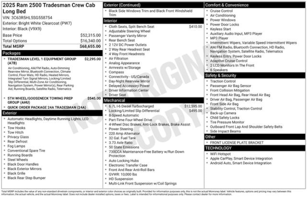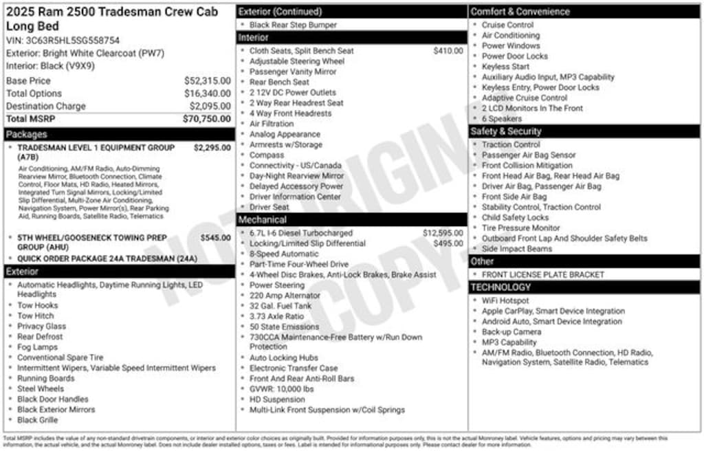 Get the job done and have fun doing it with the new Ram 2500 from Salt Lake Valley CDJR! Power, durability, and innovation come together in every Ram truck. Whether youâre working hard or exploring Utahâs backroads, the 2500 is built to handle it all. Call us today at 801-484-8755 to schedule a time to check it out! 2025 Ram 2500 Tradesman Bright White Clearcoat 6.7L I6