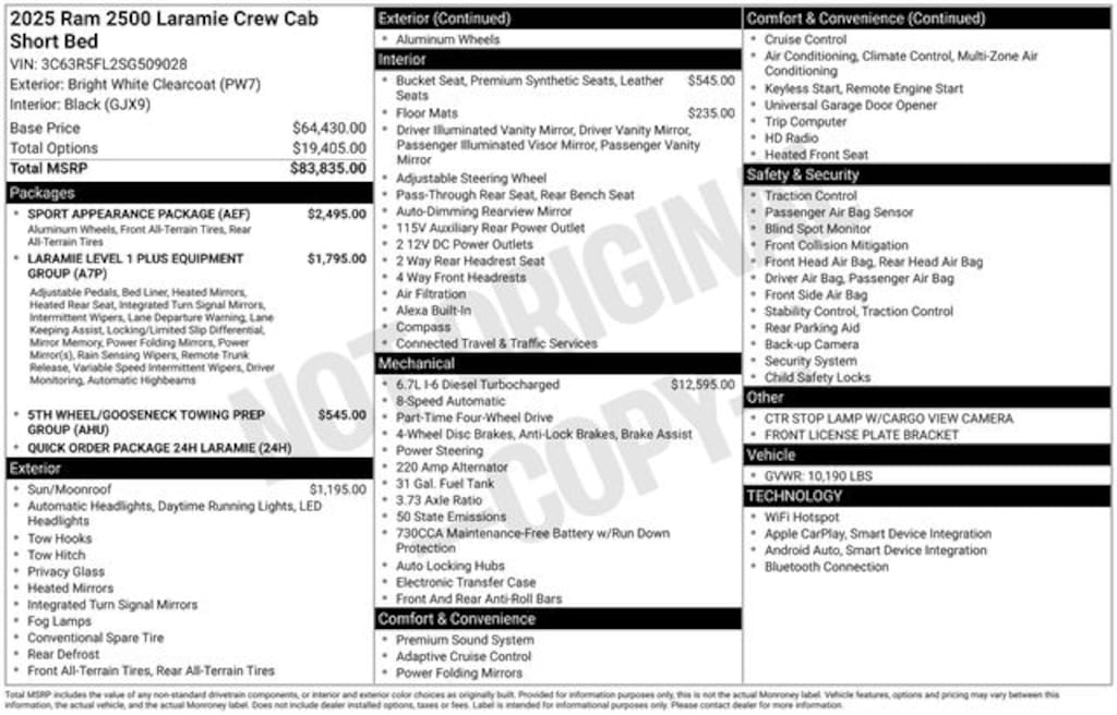 Get the job done and have fun doing it with the new Ram 2500 from Salt Lake Valley CDJR! Power, durability, and innovation come together in every Ram truck. Whether youâre working hard or exploring Utahâs backroads, the 2500 is built to handle it all. Call us today at 801-484-8755 to schedule a time to check it out! 2025 Ram 2500 Laramie Bright White Clearcoat 6.7L I6