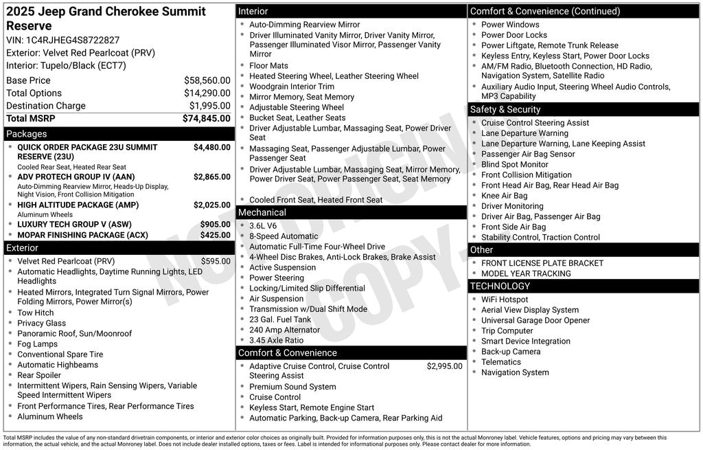 ADV Protech Group IV (Heads-Up Display, Night Vision w/Pedestrian-Animal Detection, Rearview Autodim Digital Display Mirror, and Windshield Wiper De-Icer), Hands-Free Active Driving Assist System (Auxiliary Battery), High Altitude Package (Gloss Black Exterior Accents, Neutral Gray Exterior Accents, Painted Door Cladding, and Wheels: 21" x 9" Black Painted Aluminum), Luxury Tech Group V (2nd-Row Manual Window Shades and Wireless Charging Pad), MOPAR Finishing Package (MOPAR Front Splash Guards, MOPAR Paint Protection Film, and MOPAR Rear Splash Guards w/Jeep Logo), Quick Order Package 23U Summit Reserve (19 Speakers High Performance Audio, 950 Watt Amplifier, Active Noise Control System, Deluxe Headliner, Front Passenger Interactive Display, Palermo Leather Door Trim, Palermo Leather Seats, Summit, Summit Badge, Ventilated Rear Seats, and Wheels: 21" x 9" Machined Face/Painted Aluminum), 4WD, 10 Speakers, 4-Wheel Disc Brakes, ABS brakes, Adaptive suspension, Air Conditioning, Alloy wheels, AM/FM radio: SiriusXM with 360L, Anti-whiplash front head restraints, Audio memory, Auto High-beam Headlights, Auto-dimming door mirrors, Auto-dimming Rear-View mirror, Auto-leveling suspension, Automatic temperature control, Brake assist, Bumpers: body-color, Compass, Delay-off headlights, Driver door bin, Driver vanity mirror, Dual front impact airbags, Dual front side impact airbags, Electronic Stability Control, Emergency communication system, Four wheel independent suspension, Front anti-roll bar, Front Bucket Seats, Front Center Armrest w/Storage, Front dual zone A/C, Front fog lights, Front License Plate Bracket, Front reading lights, Fully automatic headlights, Garage door transmitter, Genuine wood dashboard insert, Genuine wood door panel insert, Heated door mirrors, Heated front seats, Heated rear seats, Heated steering wheel, Illuminated entry, Knee airbag, Leather steering wheel, Low tire pressure warning, Memory seat, Model Year Tracking, Nappa Leather Seats, Navigation System, Normal Duty Suspension, Occupant sensing airbag, Outside temperature display, Overhead airbag, Overhead console, Panic alarm, Passenger door bin, Passenger vanity mirror, Power door mirrors, Power driver seat, Power Liftgate, Power moonroof, Power passenger seat, Power steering, Power windows, Radio data system, Radio: Uconnect 5 Nav w/10.1" Display, Rain sensing wipers, Rear air conditioning, Rear anti-roll bar, Rear dual zone A/C, Rear reading lights, Rear seat center armrest, Rear window defroster, Rear window wiper, Remote keyless entry, Security system, Speed control, Speed-Sensitive Wipers, Split folding rear seat, Spoiler, Steering wheel memory, Steering wheel mounted audio controls, Tachometer, Telescoping steering wheel, Tilt steering wheel, Traction control, Trip computer, Turn signal indicator mirrors, Variably intermittent wipers, Ventilated front seats, Voltmeter, and Wheels: 20" x 8.5" Fully Painted Aluminum Silver. Price may include: $2250 - 2025 National Retail Bonus Cash . Exp. 12/01/2025