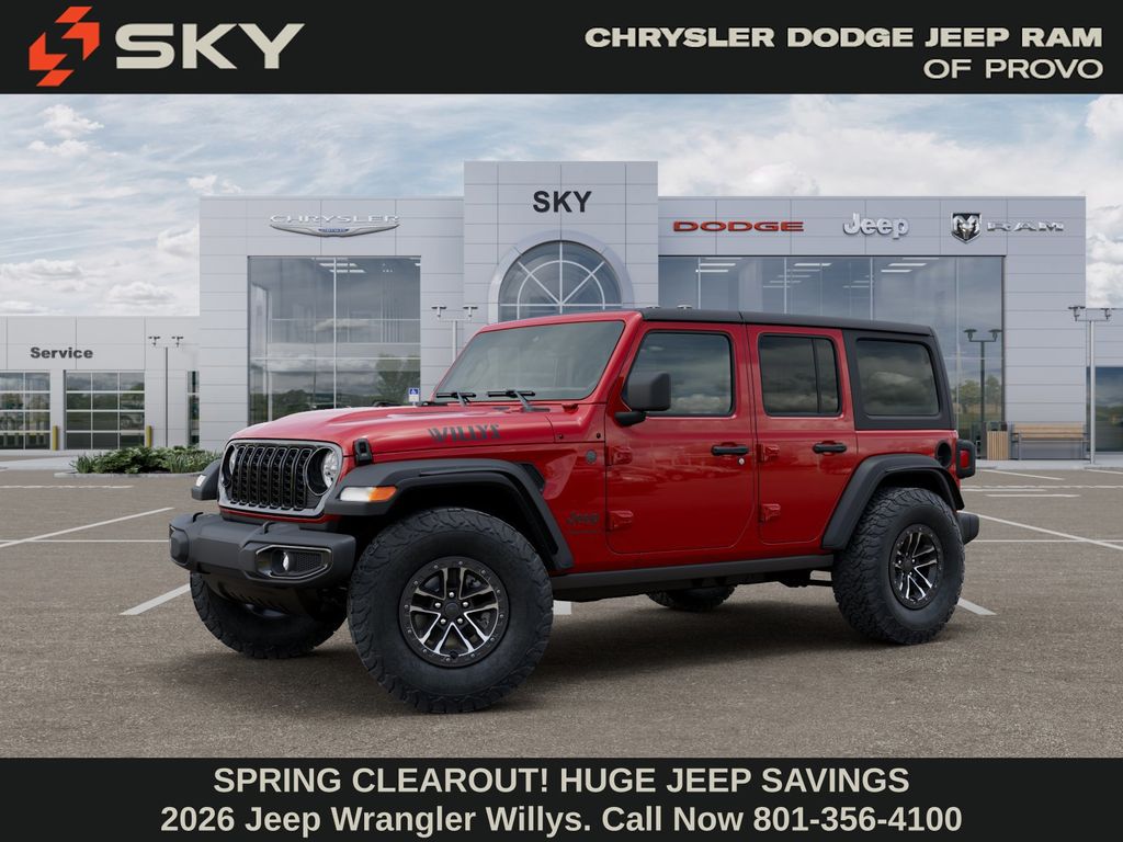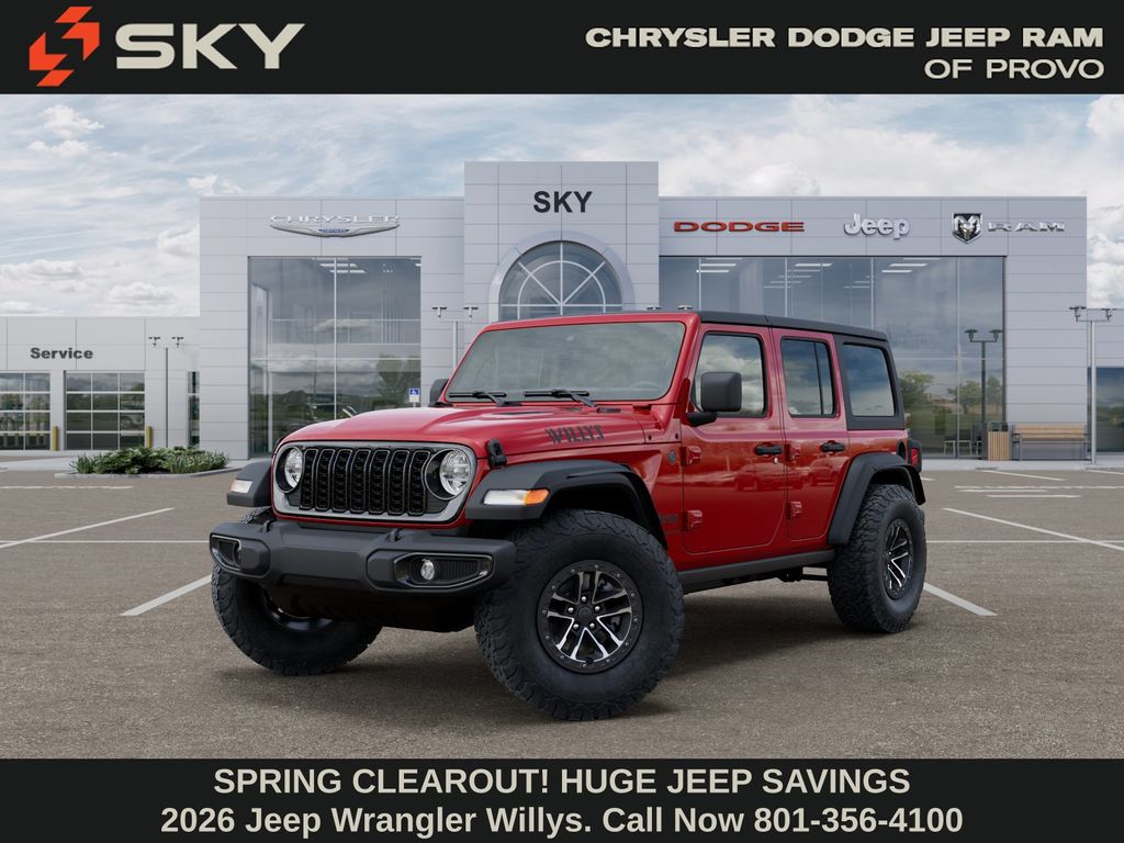 Adventure starts here with the new Jeep Wrangler, available now at Sky CDJR of Provo! As your local Jeep dealership near Salt Lake City, we know how to match Utah drivers with legendary 4x4 capability and open-road freedom. Whether itâs mountain trails or desert drives, the Wrangler is ready to take you there. Call 801-356-4100 today to start your next adventure! Firecracker Red Clearcoat 2026 Jeep Wrangler Willys 4WD 8-Speed Automatic 3.6L V6 24V VVT
