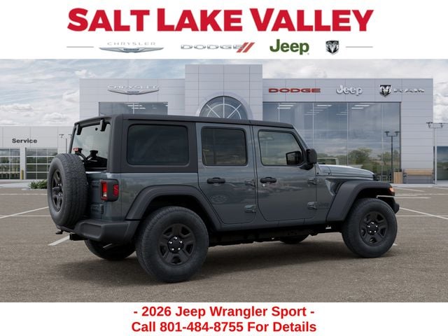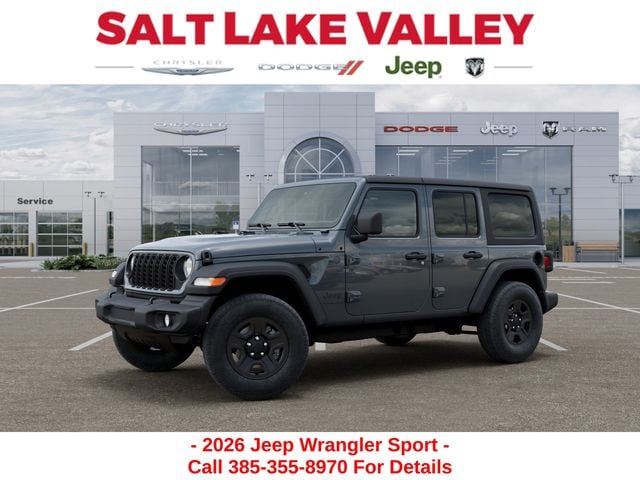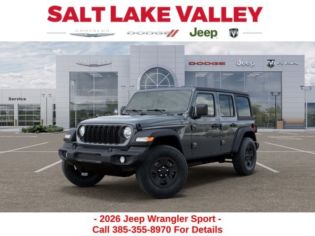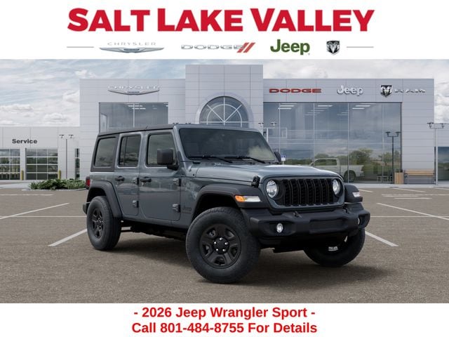 Adventure starts with the new Jeep Wrangler available now at Salt Lake Valley CDJR in Salt Lake City! Built for Utahâs canyons, trails, and highways alike, Jeep delivers freedom and capability in every mile. Discover why Wrangler drivers love to explore with confidence. Contact us at 801-484-8755 to schedule a time to see it today! 2026 Jeep Wrangler Sport Anvil Clear Coat 3.6L V6 24V VVT