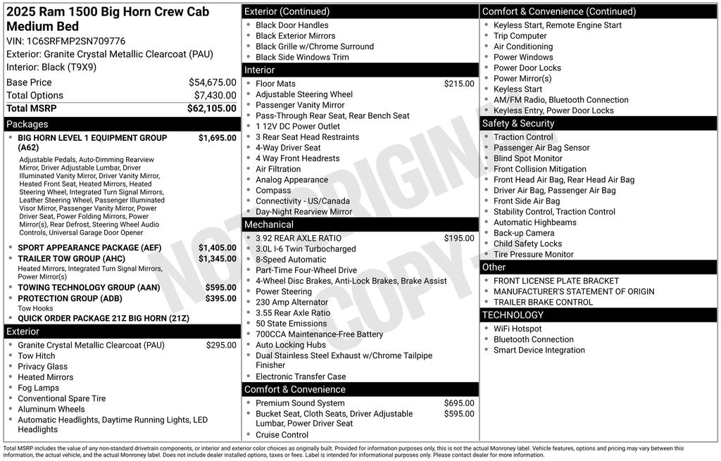 Big Horn Level 1 Equipment Group (115V Auxiliary Power Outlet, 2nd Row In Floor Storage Bins, 400W Inverter, Auto Power-Folding Mirrors, Auto-Dimming Exterior Driver Mirror, Auto-Dimming Rear-View Mirror, Black Exterior Mirrors, Black Premium Power Mirrors, Convex Wide-Angle Exterior Mirror Insert, Exterior Mirrors Courtesy Lamps, Exterior Mirrors w/Heating Element, Exterior Mirrors w/Supplemental Signals, Glove Box Lamp, Heated Front Seats, Heated Steering Wheel, Leather Wrapped Steering Wheel, Power 2-Way Driver Lumbar Adjust, Power Adjust 8-Way Driver Seat, Power Adjustable Pedals, Rear Power Sliding Window, Rear Window Defroster, Steering Wheel Mounted Audio Controls, Sun Visors w/Illuminated Vanity Mirrors, and Universal Garage Door Opener), Protection Group (Tow Hooks), Quick Order Package 21Z Big Horn, Sport Appearance Package (3 Rear Seat Head Restraints, 4 Way Front Headrests, Black Interior Accents, Body Color Door Handles, Body Color Front Bumper, Body Color Rear Bumper w/Step Pads, Body Color Tailgate Handle, Bucket Seats, Deluxe Cloth Bucket Seats, Front Seat Back Map Pockets, Full Length Floor Console, Grille Surround 1 Body Color Texture 1 Black, Manual Adjust 4-Way Front Passenger Seat, RAM Grille Badge - Chrome, Rear 60/40 Folding Seat, and Rear Center Armrest), Towing Technology Group (Trailer Hitch Line-Up Assist), Trailer Tow Group (Accent Color Tailgate Handle, Black Trailer Tow Power Mirrors, Manual Folding Exterior Mirrors, Manual Telescoping Mirrors, Mirror Clearance/Running Lights, Power-Adjustable Convex Aux Mirrors, Trailer Brake Control, Trailer Reverse Steering Control, Trailer Tire Pressure Monitoring System, and Trailer Tow Mirrors), 4-Wheel Disc Brakes, 4G LTE Wi-Fi Hot Spot, 6 Speakers, 9 Amplified Speakers w/Subwoofer, ABS brakes, Air Conditioning, Alloy wheels, AM/FM radio, Apple CarPlay/Android Auto, Auto High-beam Headlights, Brake assist, Bumpers: chrome, Cloth Bench Seat, Compass, Connectivity - US/Canada, Delay-off headlights, Driver door bin, Dual front impact airbags, Dual front side impact airbags, Electronic Stability Control, Front anti-roll bar, Front Center Armrest w/Storage, Front fog lights, Front License Plate Bracket, Front reading lights, Front wheel independent suspension, Fully automatic headlights, GPS Antenna Input, Heated door mirrors, Illuminated entry, Integrated Voice Command w/Bluetooth, Low tire pressure warning, Manufacturer's Statement of Origin, MOPAR Front & Rear Rubber Floor Mats, Occupant sensing airbag, Outside temperature display, Overhead airbag, Overhead console, Panic alarm, ParkView Rear Back-Up Camera, Passenger door bin, Passenger vanity mirror, Power door mirrors, Power steering, Power windows, Radio data system, Radio: Uconnect 5 W w/8.4" Display, Rear anti-roll bar, Rear seat center armrest, Rear step bumper, Remote keyless entry, Speed control, Split folding rear seat, Tachometer, Telescoping steering wheel, Tilt steering wheel, Traction control, Trip computer, USB Host Flip, Variably intermittent wipers, Voltmeter, and W Price may include: 10% Msrp - 2025 National 10% Below MSRP . Exp. 12/01/2025 $1,500 trade in allowance program for customers that own a 2018 or newer passenger car or truck with less than 80,000 miles and trade in their vehicle towards the purchase of a new vehicle. Some restrictions may apply. Contact dealer for details. $2,000 Down Payment Assistance. Must Finance with CCAP. May not be combined with some factory incentives. Contact dealer for d