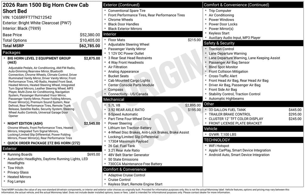 Big Horn Level 2 Equipment Group (115V Auxiliary Power Outlet, 115V Auxiliary Rear Power Outlet, 12" Touchscreen Display, 2nd Row In Floor Storage Bins, 3 Rear Seat Head Restraints, 4 Way Front Headrests, 400W Inverter, 4G LTE Wi-Fi Hot Spot, 9 Amplified Speakers w/Subwoofer, Air Conditioning ATC w/Dual Zone Control, Apple CarPlay, Auto Power-Folding Mirrors, Auto-Dimming Exterior Driver Mirror, Auto-Dimming Rear-View Mirror, Black Exterior Mirrors, Black Premium Power Mirrors, Body Color Fender Flares, Bucket Seats, Center Console Parts Module, Cluster 7.0" TFT Color Display, Configurable Drive Mode, Connected Travel & Traffic Services, Connectivity - US/Canada, Convex Wide-Angle Exterior Mirror Insert, Deluxe Cloth Bucket Seats, Disassociated Touchscreen Display, Exterior Mirrors Courtesy Lamps, Exterior Mirrors w/Heating Element, Exterior Mirrors w/Supplemental Signals, Front Seat Back Map Pockets, Full Length Floor Console, Global Telematics Box Module (TBM), Glove Box Lamp, Google Android Auto, GPS Antenna Input, GPS Navigation, HD Radio, Heated Front Seats, Heated Steering Wheel, Integrated Center Stack Radio, Integrated Voice Command w/Bluetooth, Leather Wrapped Steering Wheel, LED Dome Lamp w/On/Off Switch, LED Footwell Lighting, Manual Adjust 4-Way Front Passenger Seat, Media Hub w/2 Charge Only USBs, Overhead LED Lamps, Power 2-Way Driver Lumbar Adjust, Power Adjust 8-Way Driver Seat, Power Adjustable Pedals, Premium Overhead Console, Radio: Uconnect 5 Nav w/12.0" Display, Rear 60/40 Folding Seat, Rear Center Armrest, Rear Power Sliding Window, Rear Window Defroster, Remote Tailgate Release, Security Alarm, SiriusXM Radio Service, SiriusXM w/360L, Steering Wheel Mounted Audio Controls, Sun Visors w/Illuminated Vanity Mirrors, Universal Garage Door Opener, USB Host Flip, and Wheels: 20" x 9" Aluminum Chrome Clad (WRK)), Night Edition (Accent Color Door Handles, Accent Color Premium Power Mirrors, Accent Color Tailgate Handle, Anti-Spin Differential Rear Axle, Black Exterior Truck Badging, Black Headlamp Bezels, Black Interior Accents, Black Painted Exterior Mirrors Caps, Black Tail Lamp Bezels, Body Color Front Bumper, Body Color Rear Bumper w/Step Pads, Dual Exhaust w/Black Tips, Grille Black Surround Black Mesh, RAM Grille Badge - Black, and Wheels: 20" x 9.0" Aluminum Painted Clad), Quick Order Package 27Z Big Horn, 33 Gallon Fuel Tank, 4-Wheel Disc Brakes, 48V Belt Starter Generator, 6 Speakers, ABS brakes, Air Conditioning, Alloy wheels, AM/FM radio, Apple CarPlay/Android Auto, Auto High-beam Headlights, Brake assist, Bumpers: chrome, Cloth Bucket Seats, Cluster 12" TFT Color Display, Compass, Delay-off headlights, Driver door bin, Dual front impact airbags, Dual front side impact airbags, Electronic Stability Control, Front anti-roll bar, Front Bucket Seats, Front Center Armrest w/Storage, Front fog lights, Front License Plate Bracket, Front reading lights, Front wheel independent suspension, Fully automatic headlights, Heated door mirrors, Illuminated entry, Price may include: $3500 - 2026 National Retail Consumer Cash . Exp. 12/01/2025 $1,500 trade in allowance program for customers that own a 2018 or newer passenger car or truck with less than 80,000 miles and trade in their vehicle towards the purchase of a new vehicle. Some restrictions may apply. Contact dealer for details. $1,000 Down Payment Assistance. Must Finance with CCAP. May not be combined with some factory incentives. Contact dealer for d