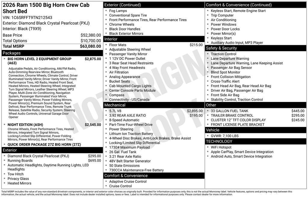 Big Horn Level 2 Equipment Group (115V Auxiliary Power Outlet, 115V Auxiliary Rear Power Outlet, 12" Touchscreen Display, 2nd Row In Floor Storage Bins, 3 Rear Seat Head Restraints, 4 Way Front Headrests, 400W Inverter, 4G LTE Wi-Fi Hot Spot, 9 Amplified Speakers w/Subwoofer, Air Conditioning ATC w/Dual Zone Control, Apple CarPlay, Auto Power-Folding Mirrors, Auto-Dimming Exterior Driver Mirror, Auto-Dimming Rear-View Mirror, Black Exterior Mirrors, Black Premium Power Mirrors, Body Color Fender Flares, Bucket Seats, Center Console Parts Module, Cluster 7.0" TFT Color Display, Configurable Drive Mode, Connected Travel & Traffic Services, Connectivity - US/Canada, Convex Wide-Angle Exterior Mirror Insert, Deluxe Cloth Bucket Seats, Disassociated Touchscreen Display, Exterior Mirrors Courtesy Lamps, Exterior Mirrors w/Heating Element, Exterior Mirrors w/Supplemental Signals, Front Seat Back Map Pockets, Full Length Floor Console, Global Telematics Box Module (TBM), Glove Box Lamp, Google Android Auto, GPS Antenna Input, GPS Navigation, HD Radio, Heated Front Seats, Heated Steering Wheel, Integrated Center Stack Radio, Integrated Voice Command w/Bluetooth, Leather Wrapped Steering Wheel, LED Dome Lamp w/On/Off Switch, LED Footwell Lighting, Manual Adjust 4-Way Front Passenger Seat, Media Hub w/2 Charge Only USBs, Overhead LED Lamps, Power 2-Way Driver Lumbar Adjust, Power Adjust 8-Way Driver Seat, Power Adjustable Pedals, Premium Overhead Console, Radio: Uconnect 5 Nav w/12.0" Display, Rear 60/40 Folding Seat, Rear Center Armrest, Rear Power Sliding Window, Rear Window Defroster, Remote Tailgate Release, Security Alarm, SiriusXM Radio Service, SiriusXM w/360L, Steering Wheel Mounted Audio Controls, Sun Visors w/Illuminated Vanity Mirrors, Universal Garage Door Opener, USB Host Flip, and Wheels: 20" x 9" Aluminum Chrome Clad (WRK)), Night Edition (Accent Color Door Handles, Accent Color Premium Power Mirrors, Accent Color Tailgate Handle, Anti-Spin Differential Rear Axle, Black Exterior Truck Badging, Black Headlamp Bezels, Black Interior Accents, Black Painted Exterior Mirrors Caps, Black Tail Lamp Bezels, Body Color Front Bumper, Body Color Rear Bumper w/Step Pads, Dual Exhaust w/Black Tips, Grille Black Surround Black Mesh, RAM Grille Badge - Black, and Wheels: 20" x 9.0" Aluminum Painted Clad), Quick Order Package 27Z Big Horn, 33 Gallon Fuel Tank, 4-Wheel Disc Brakes, 48V Belt Starter Generator, 6 Speakers, ABS brakes, Air Conditioning, Alloy wheels, AM/FM radio, Apple CarPlay/Android Auto, Auto High-beam Headlights, Brake assist, Bumpers: chrome, Cloth Bucket Seats, Cluster 12" TFT Color Display, Compass, Delay-off headlights, Driver door bin, Dual front impact airbags, Dual front side impact airbags, Electronic Stability Control, Front anti-roll bar, Front Bucket Seats, Front Center Armrest w/Storage, Front fog lights, Front License Plate Bracket, Front reading lights, Front wheel independent suspension, Fully automatic headlights, Heated door mirrors, Illuminat Price may include: $3500 - 2026 National Retail Consumer Cash . Exp. 12/01/2025 $1,500 trade in allowance program for customers that own a 2018 or newer passenger car or truck with less than 80,000 miles and trade in their vehicle towards the purchase of a new vehicle. Some restrictions may apply. Contact dealer for details. $1,000 Down Payment Assistance. Must Finance with CCAP. May not be combined with some factory incentives. Contact dealer for d