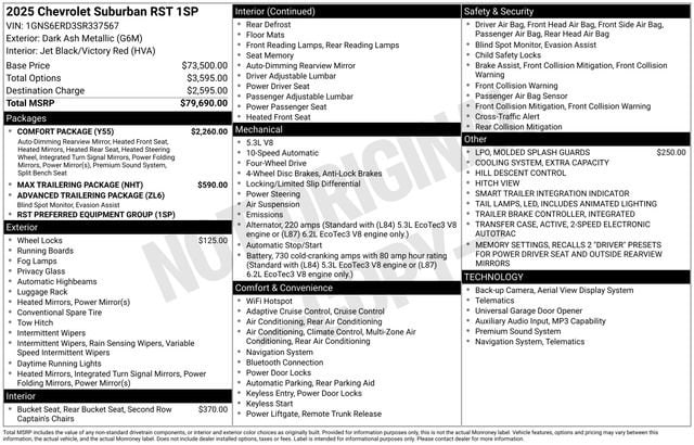 Whether you're hauling the family, towing a trailer, or simply seeking a premium daily driver, the 2025 Chevrolet Suburban RST is ready to elevate your driving experience. We invite you to visit our showroom and take this remarkable SUV for a test drive. Our knowledgeable team is here to answer any questions and ensure you find the perfect vehicle to suit your lifestyle.