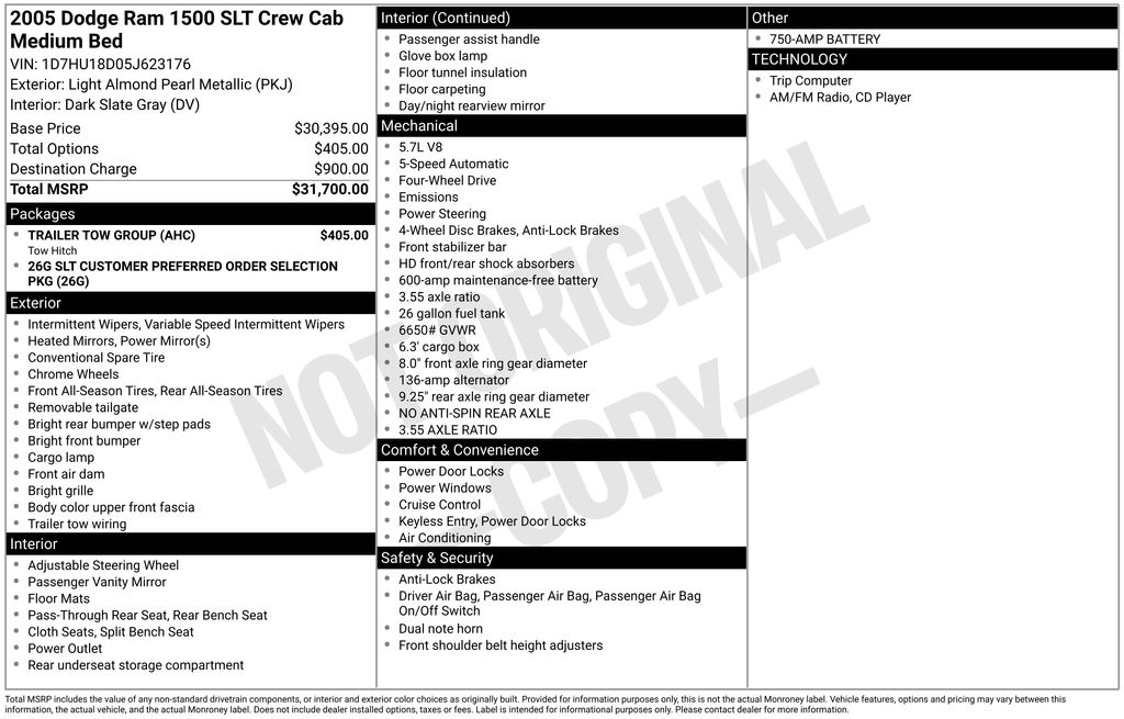 Check out our award winning dealership! 5-star google review, drive a little save a lot. Quick Order Package 26G SLT, Trailer Tow Group (7 Pin Wiring Harness, 750 Amp Maintenance Free Battery, and Class IV Receiver Hitch), HEMI Magnum 5.7L V8 SMPI, 4WD, 17" x 8" Chrome Clad Steel Wheels, 4 Speakers, 4-Wheel Disc Brakes, 40/20/40 Split Bench Seat, ABS brakes, Air Conditioning, AM/FM Compact Disc w/Changer Control, AM/FM radio, Bumpers: chrome, CD player, Cloth 40/20/40 Split Bench Seat, Compass, Driver door bin, Dual front impact airbags, Electronically Controlled Throttle, EVAP Control System, Folding Rear Seat, Front anti-roll bar, Front Center Armrest, Front reading lights, Front wheel independent suspension, Heated door mirrors, Heavy-Duty Engine Cooling, Illuminated entry, Next Generation Engine Controller, Outside temperature display, Overhead console, Panic alarm, Passenger door bin, Passenger vanity mirror, Power door mirrors, Power steering, Power windows, Rear step bumper, Remote keyless entry, Speed control, Speed-Sensitive Wipers, Tachometer, Tilt steering wheel, Trip computer, Variably intermittent wipers, and Voltmeter Sale Price Includes $1,000 Finance Savings. Contact Dealer For Details.