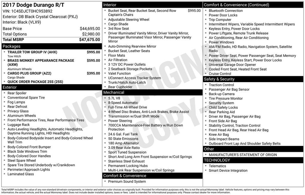 DB Black Crystal Clearcoat 2017 Dodge Durango R/T AWD 8-Speed Automatic HEMI 5.7L V8 Multi Displacement VVT AWD.