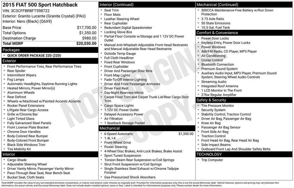 Granito Lucente (Granite Crystal) 2015 Fiat 500 Sport FWD 6-Speed Aisin F21-250 Auto 1.4L I4 16V MultiAir