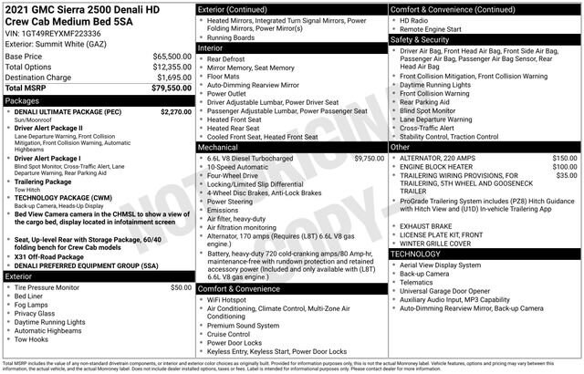 Take your drives to the next level with this GMC Sierra 2500HD from Salt Lake Valley Buick GMC! Engineered for a smooth ride, advanced convenience, and lasting dependability, this vehicle is ready to handle everything your day throws at you. Plus, enjoy a $1,000 finance savings, already included in the sale price, when you finance through one of our trusted lending partners. Looking for quality used cars in Salt Lake City? This GMC Sierra 2500HD delivers style, versatility, and value - perfect for daily commutes, family trips, or weekend adventures. Stop by Salt Lake Valley Buick GMC to see this vehicle in person and explore our wide selection of pre-owned cars, trucks, and SUVs. Browse online at www.slvbuickgmc.com or call 801-265-1511 to schedule your test drive today! With Denali Ultimate Package (Power Sunroof), Driver Alert Package I (Lane Change Alert w/Side Blind Zone Alert, Rear Cross Traffic Alert, and Ultrasonic Front & Rear Park Assist), Driver Alert Package II (Automatic Emergency Braking, Following Distance Indicator, Forward Collision Alert, IntelliBeam Automatic High Beam On/Off, and Lane Departure Warning System), Preferred Equipment Group 5SA (12-Volt Rear Auxiliary Power Outlet, 120-Volt Bed Mounted Power Outlet, 120-Volt Instrument Panel Power Outlet, 2 USB Ports, 2 USB Ports (1st Row), 2-Speed Active Transfer Case, 2nd Row Dual USB Charge-Only Ports, 4G LTE Wi-Fi Hotspot Capable, 6 Rectangular Chromed Tubular Assist Steps, Bed View Camera w/2 Trailer Camera Provisions, Chrome Recovery Hooks, Compass Located In Instrument Cluster, Deep-Tinted Glass, Electric Rear-Window Defogger, Electrical Lock Control Steering Column, Floor-Mounted Center Console, GMC Connected Access Capable, HD Surround Vision, Heated & Ventilated Front Bucket Seats, Heated 2nd Row Outboard Seats, Heated Driver & Front Outboard Passenger Seats, Integrated Trailer Brake Controller, Keyless Open & Start, LED Cargo Area Lighting, LED Smoked Amber Roof Marker Lamps, Manual Tilt-Wheel/Telescoping Steering Column, OnStar & GMC Connected Services Capable, Polished Exhaust Tip, Power Door Locks, Power Front Passenger Windows w/Express Up/Down, Power Rear Windows w/Express Down, Power Sliding Rear Window w/Defogger, Power Windows w/Driver Express Up/Down, Rear Wheelhouse Liners, Remote Vehicle Starter System, Safety Alert Seat, Signature Denali Grille, Spray-On Pickup Box Bed Liner w/Denali Logo, Steering Wheel Audio Controls, Unauthorized Entry Theft-Deterrent System, Universal Home Remote, Wireless Charging, and Wireless Phone Projection), Technology Package (Inside Rearview Auto-Dimming Rear Camera Mirror and Multicolor 15 Diagonal Head-Up Display), X31 Off-Road Package (Hill Descent Control), 10-Way Power Driver Seat Adjuster w/Lumbar, 10-Way Power Passenger Seat Adjuster w/Lumbar, 220 Amps Alternator, 4-Wheel Disc Brakes, 5th Wheel & Gooseneck Trailer Wiring Provisions, 7 Speakers, ABS brakes, Air Conditioning, Alloy wheels, AM/FM radio: SiriusXM with 360L, Apple CarPlay/Android Auto, Auto High-beam Headlights, Auto-dimming door mirrors, Auto-dimming Rear-View mirror, Automatic temperature control, Bose Premium 7 Speaker Sound System, Brake assist, Bumpers: body-color, Compass, Delay-off headlights, Driver door bin, Driver Memory, Driver vanity mirror, Dual front impact airbags, Dual front side impact airbags, Electronic Stability Control, Engine Block Heater, Exhaust Brake, Exterior Parking Camera Rear, Forge Perforated Leather-Appointed Front Seat Trim, Front anti-roll bar, Front Bucket Seats, Front Center Armrest, Front dual zone A/C, Front fog lights, Front License Plate Kit, Front reading lights, Front wheel independent suspension, Fully automatic headlights, Garage door transmitter, Genuine wood console insert, Genuine wood door panel insert, HD Radio, Heated door mirrors, Heated front seats, Heated rear seats, Heated steering wheel, Heavy-Duty 80 Amp Battery, Hitch Guidance w/Hitch Vie