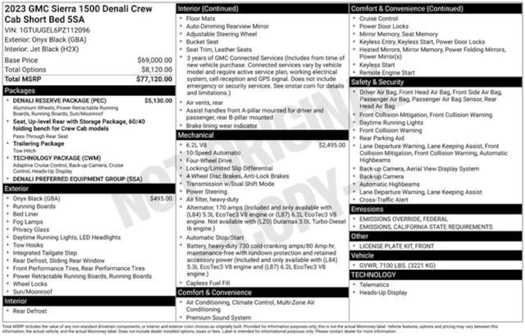 Take your drives to the next level with this GMC Sierra 1500 from Salt Lake Valley Buick GMC! Engineered for a smooth ride, advanced convenience, and lasting dependability, this vehicle is ready to handle everything your day throws at you. Plus, enjoy a $1,000 finance savings, already included in the sale price, when you finance through one of our trusted lending partners. Looking for quality used cars in Salt Lake City? This GMC Sierra 1500 delivers style, versatility, and value - perfect for daily commutes, family trips, or weekend adventures. Stop by Salt Lake Valley Buick GMC to see this vehicle in person and explore our wide selection of pre-owned cars, trucks, and SUVs. Browse online at www.slvbuickgmc.com or call 801-265-1511 to schedule your test drive today! With Denali Reserve Package (GMC MultiPro Power Steps, Power Sunroof, Wheel Locks (Set of 4) (LPO), and Wheels: 22 x 9 Painted Aluminum), Preferred Equipment Group 5SA (120-Volt Bed Mounted Power Outlet, 120-Volt Instrument Panel Power Outlet, 170 Amp Alternator, 2 Charge/Data USB Ports Inside Center Console, 2 Type-C Charge-Only Rear USB Ports, 2 USB Ports, Auto-Locking Rear Differential, Auxiliary External Transmission Oil Cooler, Bed View Camera, Chrome Header w/Signature Denali Chrome Grille, Chrome Recovery Hooks, Chrome Wheel To Wheel Assist Steps, Color-Keyed Carpeting Floor Covering, Compass, Deep-Tinted Glass, Electric Rear-Window Defogger, Electrical Steering Column Lock, Floor-Mounted Center Console, Front Rainsensing Wipers, GMC Connected Access Capable, HD Surround Vision, Heated 2nd Row Outboard Seats, Heated Driver & Front Outboard Passenger Seating, Heavy-Duty Air Filter, Hill Descent Control, Hitch Guidance w/Hitch View, In-Vehicle Trailering App, Integrated Trailer Brake Controller, Keyless Open & Start, LED Cargo Area Lighting, OnStar & GMC Connected Services Capable, Perimeter Lighting, Power Door Locks, Power Front Passenger Windows w/Express Up/Down, Power Front Windows w/Driver Express Up/Down, Power Rake & Telescoping Steering Column, Power Rear Windows w/Express Down, Power Sliding Rear Window w/Rear Defogger, Premium Bose 7-Speaker Sound System, Push Button Start, Rear Cross Traffic Braking, Rear Pedestrian Detection, Rear Wheelhouse Liners, Remote Vehicle Starter System, SiriusXM w/360L, Spray-On Pickup Bed Liner w/Denali Logo, Steering Wheel Audio Controls, Theft Deterrent System (Unauthorized Entry), Trailer Camera Provisions, Trailer Side Blind Zone Alert, Ultrasonic Front & Rear Park Assist, Universal Home Remote, Ventilated Driver & Front Passenger Seats, Wi-Fi Hotspot Capable, Wireless Charging, and Wireless Phone Projection), Technology Package (Adaptive Cruise Control, Multicolor 15 Diagonal Head-Up Display, and Rear Camera Mirror), Trailering Package (Hitch Guidance), 10-Way Power Driver Seat Adjuster w/Lumbar, 10-Way Power Passenger Seat Adjuster w/Lumbar, 3.23 Rear Axle Ratio, 4-Wheel Disc Brakes, 7 Speakers, ABS brakes, Adaptive suspension, Air Conditioning, Alloy wheels, AM/FM radio, Apple CarPlay/Android Auto, Auto High-beam Headlights, Auto-dimming door mirrors, Auto-dimming Rear-View mirror, Automatic Emergency Braking, Automatic temperature control, Brake assist, Buckle to Drive, Bumpers: body-color, Delay-off headlights, Denali Premium Suspension w/Adaptive Ride Control, Driver door bin, Driver Memory, Driver vanity mirror, Dual front impact airbags, Dual front side impact airbags, Electronic Stability Control, Emergency communication system: OnStar and GMC connected services capable, Following Distance Indicator, Forge Perforated Leather Seat Trim, Forward Collision Alert, Front anti-roll bar, Front Bucket Seats, Front Center Armrest, Front dual zone A/C, Front fog lights, Front License Plate Kit, Front Pedestrian Braking, Front reading lights, Front wheel independent suspension, Fully automatic headlights, Garage door transmitter, Genuine wood console insert, Genuine wood dashboard insert, Genuine wood door panel i