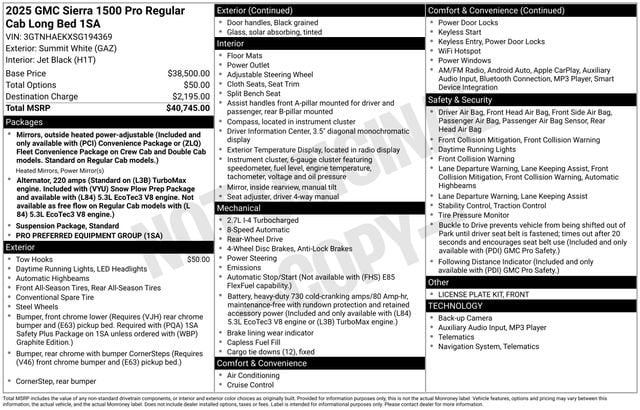 Take your drives to the next level with this GMC Sierra 1500 from Salt Lake Valley Buick GMC! Engineered for a smooth ride, advanced convenience, and lasting dependability, this vehicle is ready to handle everything your day throws at you. Plus, enjoy a $1,000 finance savings, already included in the sale price, when you finance through one of our trusted lending partners. Looking for quality used cars in Salt Lake City? This GMC Sierra 1500 delivers style, versatility, and value - perfect for daily commutes, family trips, or weekend adventures. Stop by Salt Lake Valley Buick GMC to see this vehicle in person and explore our wide selection of pre-owned cars, trucks, and SUVs. Browse online at www.slvbuickgmc.com or call 801-265-1511 to schedule your test drive today! With Preferred Equipment Group 1SA (2 Charge/Data USB Ports, 220 Amp Alternator, Chrome Header w/Flat Black Grille Insert Bars, HD Rear Vision Camera, OnStar Services Capable, Power Door Locks, Power Front Windows w/Driver Express Up/Down, Power Front Windows w/Passenger Express Down, Push Button Start, Remote Keyless Entry, Solar Absorbing Tinted Glass, and Wi-Fi Hotspot Capable), Standard Suspension Package, 2 Speakers, 2-Speaker Audio System Feature, 3.42 Rear Axle Ratio, 4-Way Manual Driver Seat Adjuster, 4-Way Manual Passenger Seat Adjuster, 4-Wheel Disc Brakes, ABS brakes, Air Conditioning, AM/FM radio, Apple CarPlay/Android Auto, Auto High-beam Headlights, Automatic Emergency Braking, Brake assist, Buckle to Drive, Bumpers: chrome, Compass, Delay-off headlights, Driver door bin, Dual front impact airbags, Dual front side impact airbags, Electronic Stability Control, Emergency communication system: OnStar, Following Distance Indicator, Forward Collision Alert, Front 40/20/40 Split-Bench Seat, Front anti-roll bar, Front Center Armrest w/Storage, Front Frame-Mounted Black Recovery Hooks, Front License Plate Kit, Front Pedestrian Braking, Front reading lights, Front wheel independent suspension, Fully automatic headlights, Heated door mirrors, Illuminated entry, IntelliBeam Automatic High Beam On/Off, Lane Keep Assist w/Lane Departure Warning, Low tire pressure warning, Occupant sensing airbag, Outside temperature display, Overhead airbag, Overhead console, Panic alarm, Passenger door bin, Passenger vanity mirror, Power door mirrors, Power steering, Power windows, Radio data system, Radio: GMC Infotainment Audio System, Rear reading lights, Rear step bumper, Remote keyless entry, Speed control, Speed-sensing steering, Tachometer, Tilt steering wheel, Traction control, Trip computer, Variably intermittent wipers, Vinyl Seat Trim, Voltmeter, Wheels: 17 x 8 Silver Painted Steel, and Wireless Apple CarPlay/Wireless Android Auto designed for convenience and enjoyment, this GMC Sierra 1500 is ready to take you wherever you want to go.