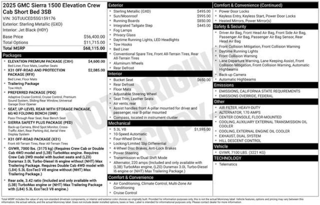 Take your drives to the next level with this GMC Sierra 1500 from Salt Lake Valley Buick GMC! Engineered for a smooth ride, advanced convenience, and lasting dependability, this vehicle is ready to handle everything your day throws at you. Plus, enjoy a $1,000 finance savings, already included in the sale price, when you finance through one of our trusted lending partners. Looking for quality used cars in Salt Lake City? This GMC Sierra 1500 delivers style, versatility, and value - perfect for daily commutes, family trips, or weekend adventures. Stop by Salt Lake Valley Buick GMC to see this vehicle in person and explore our wide selection of pre-owned cars, trucks, and SUVs. Browse online at www.slvbuickgmc.com or call 801-265-1511 to schedule your test drive today! With Cloth Rear Seat w/Storage Package, Elevation Premium Package (All-Weather Floor Liner (LPO), Leather-Appointed Seat Trim, and Spray-On Pickup Bedliner w/GMC Logo), High Capacity Suspension Package, Preferred Equipment Group 3SB (120-Volt Bed Mounted Power Outlet, 120-Volt Interior Power Outlet, 2 Charge/Data USB Ports, 2 Type-C Charge-Only Rear USB Ports, 6-Speaker Audio System Feature, Auto-Locking Rear Differential, Body Color Header w/Gloss Black Mesh Grille Bars, Color-Keyed Carpeting Floor Covering, Deep-Tinted Glass, Electric Rear-Window Defogger, Front Frame-Mounted Black Recovery Hooks, Front Rubberized-Vinyl Floor Mats, HD Rear Vision Camera, Integrated Trailer Brake Controller, Keyless Open & Start, LED Cargo Area Lighting, Manual Tilt-Wheel & Telescoping Steering Column, OnStar Services Capable, Power Door Locks, Power Front Windows w/Driver Express Up/Down, Power Front Windows w/Passenger Express Down, Power Rear Windows w/Express Down, Push Button Start, Rear Rubberized-Vinyl Floor Mats, Remote Vehicle Starter System, SiriusXM w/360L Trial Subscription, Steering Wheel Audio Controls, Theft Deterrent System (Unauthorized Entry), and Wi-Fi Hotspot Capable), Preferred Package (Adaptive Cruise Control, Hitch View, In-Vehicle Trailering System App, Power Sliding Rear Window w/Rear Defogger, Premium Bose 7-Speaker Sound System, Rear Wheelhouse Liners, and Universal Home Remote), Sierra Safety Plus Package (HD Surround Vision, High Gloss Black Mirror Caps, Perimeter Lighting, Rear Cross Traffic Braking, Rear Pedestrian Detection, Trailer Camera Provisions, Trailer Side Blind Zone Alert, and Ultrasonic Front & Rear Park Assist), Trailering Package (Hitch Guidance), Up-Level Rear Seat w/Storage Package, X31 Off-Road & Protection Package, X31 Off-Road Package (Dual Exhaust System, Heavy-Duty Air Filter, Hill Descent Control, Off-Road Suspension, and X31 Hard Badge), 10-Way Power Driver Seat Adjuster w/Lumbar, 170 Amp Alternator, 2 Charge/Data USB Ports Inside Center Console, 220 Amp Alternator, 3.23 Rear Axle Ratio, 3.42 Rear Axle Ratio, 4-Way Manual Passenger Seat Adjuster, 4-Wheel Disc Brakes, 6 Speakers, 6 Rectangular Black Tubular Assist Steps (LPO), ABS brakes, Air Conditioning, Alloy wheels, AM/FM radio: SiriusXM with 360L, Apple CarPlay/Android Auto, Auto High-beam Headlights, Automatic Emergency Braking, Automatic temperature control, Auxiliary External Transmission Oil Cooler, Brake assist, Buckle to Drive, Bumpers: body-color, Cloth Seat Trim, Compass, Delay-off headlights, Driver door bin, Driver vanity mirror, Dual front impact airbags, Dual front side impact airbags, Electronic Precision Shift, Electronic Stability Control, Emergency communication system: OnStar, External Engine Oil Cooling, Floor-Mounted Center Console, Following Distance Indicator, Forward Collision Alert, Front 40/20/40 Split-Bench Seat, Front anti-roll bar, Front Bucket Seats, Front Center Armrest w/Storage, Front dual zone A/C, Front fog lights, Front License Plate Kit, Front Pedestrian Braking, Front reading lights, Front wheel independent suspension, Fully automatic headlights, Genuine wood dashboard insert, GMC MultiPro Tailgate, Heated door mirrors, Heated Driver & F
