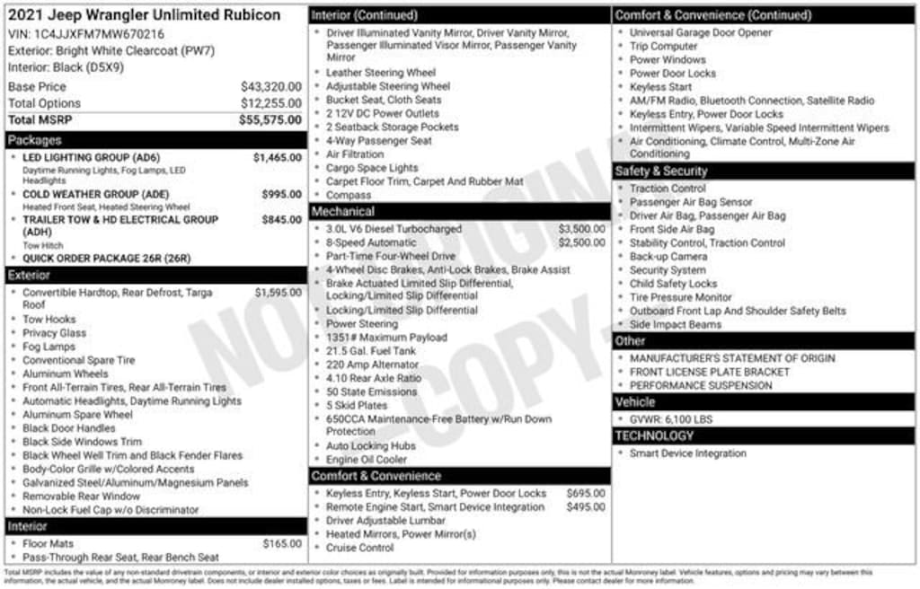 Take your drives to the next level with this Jeep Wrangler from Salt Lake Valley Buick GMC! Engineered for a smooth ride, advanced convenience, and lasting dependability, this vehicle is ready to handle everything your day throws at you. Plus, enjoy a $1,000 finance savings, already included in the sale price, when you finance through one of our trusted lending partners. Looking for quality used cars in Salt Lake City? This Jeep Wrangler delivers style, versatility, and value - perfect for daily commutes, family trips, or weekend adventures. Stop by Salt Lake Valley Buick GMC to see this vehicle in person and explore our wide selection of pre-owned cars, trucks, and SUVs. Browse online at www.slvbuickgmc.com or call 801-265-1511 to schedule your test drive today! With Cold Weather Group (Heated Front Seats and Heated Steering Wheel), LED Lighting Group (Daytime Running Lamps LED Accents, Front LED Fog Lamps, LED Premium Reflector Headlamps, and LED Taillamps), Quick Order Package 26R, Trailer Tow & HD Electrical Group (240 Amp Alternator, 7 & 4 Pin Wiring Harness, 700 Amp Maintenance Free Battery, Auxiliary Switches, and Class II Receiver Hitch), 4-Wheel Disc Brakes, 8 Speakers, ABS brakes, Air Conditioning, Alloy wheels, AM/FM radio: SiriusXM, Apple CarPlay/Android Auto, Automatic temperature control, Aux Battery, Black 3-Piece Hard Top, Brake assist, Compass, Delay-off headlights, Driver door bin, Driver vanity mirror, Dual front impact airbags, Dual front side impact airbags, Electronic Stability Control, Freedom Panel Storage Bag, Front anti-roll bar, Front Bucket Seats, Front Center Armrest w/Storage, Front dual zone A/C, Front fog lights, Front License Plate Bracket, Front reading lights, Fully automatic headlights, Garage door transmitter, Heated door mirrors, Illuminated entry, Integrated roll-over protection, Leather steering wheel, Low tire pressure warning, Manufacturer's Statement of Origin, MOPAR All-Weather Floor Mats (DISC), No Soft Top, Non-Lock Fuel Cap w/o Discriminator, Occupant sensing airbag, Outside temperature display, Panic alarm, ParkView Rear Back-Up Camera, Passenger door bin, Passenger vanity mirror, Performance Suspension, Power door mirrors, Power steering, Power windows, Premium Cloth Low-Back Bucket Seats, Radio data system, Radio: Uconnect 4 w/7 Display, Rear anti-roll bar, Rear reading lights, Rear Window Defroster, Rear Window Wiper/Washer, Remote keyless entry, Remote Proximity Keyless Entry, Remote Start System, Security system, Speed control, Split folding rear seat, Steering wheel mounted audio controls, Stop-Start Dual Battery System, Tachometer, Telescoping steering wheel, Tilt steering wheel, Traction control, Trip computer, Variably intermittent wipers, Voltmeter, and Wheels: 17 x 7.5 Machined w/Black Pockets designed for convenience and enjoyment, this Jeep Wrangler is ready to take you wherever you want to go.