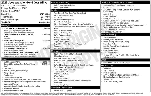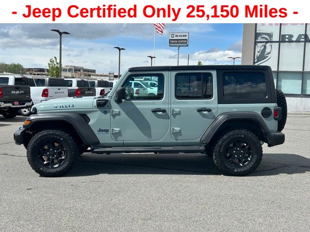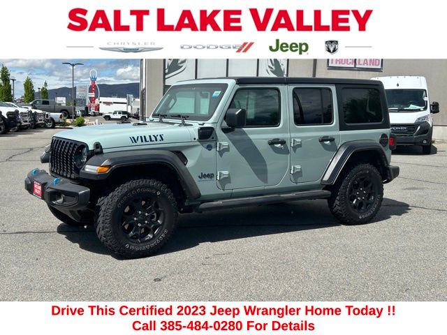 Get ready to hit the road in this Jeep Wrangler, a standout choice for drivers looking for reliability, performance, and style! This impressive vehicle is packed with premium features designed to make every drive more enjoyable. Price excludes tax, title, license fee, government fees, and $449 dealer documentary service fee. While every reasonable effort is made to ensure accuracy, we are not responsible for errors or omissions, and vehicles may be sold prior to inquiryâ"please contact the dealer to confirm availability. All financing is subject to approved credit. Whether youâre searching for used cars in Salt Lake City, a dependable SUV, or a powerful truck, this Jeep Wrangler delivers everything you need and more. Visit Salt Lake Valley Chrysler Dodge Jeep Ram today to test drive or explore our entire selection of quality pre-owned vehicles. Donât wait - shop online at www.slvcdjr.com or call 801-484-8755 to learn more! This amazing vehicle comes loaded with options like 8.4" Radio Group (1-Year SiriusXM Guardian Trial, 4G LTE Wi-Fi Hot Spot, 5-Year SiriusXM Traffic Service, 5-Year SiriusXM Travel Link Service, 8.4" Touchscreen Display, Apple CarPlay, Auto-Dimming Rear-View Mirror, Emergency/Assistance Call, For Details, Visit DriveUconnect.com, Google Android Auto, GPS Antenna Input, GPS Navigation, HD Radio, Integrated Center Stack Radio, Integrated Voice Command w/Bluetooth, Off-Road Info Pages, Radio: Uconnect 4C Nav w/8.4" Display, SiriusXM Traffic Plus, SiriusXM Travel Link, and USB Host Flip), Cold Weather Group (Remote Start System), Convenience Group (Universal Garage Door Opener), Quick Order Package 29W Willys (4xe 4-Wheel Drive Swing Gate Decal, 97 MPH Vehicle Max Speed Calibration, Anti-Spin Differential Rear Axle, Black Grille, Front LED Fog Lamps, LED Headlamp & Fog Lamp Group, LED Premium Reflector Headlamps, Molded-In-Color Fender Flares (2-Piece), MOPAR All-Weather Floor Mats, Normal Duty Suspension, Wheels: 17" x 7.5" Black Aluminum, Willys, and Willys 4xe Hood Decal), Trailer Tow & Aux Switch Group (700 Amp Maintenance Free Battery and Auxiliary Switches), 3.73 Rear Axle Ratio, 4-Wheel Disc Brakes, 9 Speakers, ABS brakes, Air Conditioning, Alloy wheels, AM/FM radio: SiriusXM, Apple CarPlay/Android Auto, Automatic temperature control, Black 3-Piece Hard Top, Brake assist, Cloth Low-Back Bucket Seats, Compass, Delay-off headlights, Driver door bin, Driver vanity mirror, Dual front impact airbags, Dual front side impact airbags, Electronic Stability Control, Emergency communication system: SiriusXM Guardian, Front anti-roll bar, Front Bucket Seats, Front Center Armrest w/Storage, Front dual zone A/C, Front fog lights, Front License Plate Bracket, Front reading lights, Fully automatic headlights, Heated door mirrors, Illuminated entry, Integrated roll-over protection, Low tire pressure warning, Occupant sensing airbag, Outside temperature display, Panic alarm, ParkView Rear Back-Up Camera, Passenger door bin, Passenger vanity mirror, Power door mirrors, Power steering, Power windows, Radio data system, Radio: Uconnect 4 w/7" Display, Rear anti-roll bar, Rear reading lights, Remote keyless entry, Security system, Speed control, Split folding rear seat, Steering wheel mounted audio controls, Tachometer, Telescoping steering wheel, Tilt steering wheel, Traction control, Trip computer, Variably intermittent wipers, and Voltmeter, making it the perfect choice for your next adventure. Jeep Details: