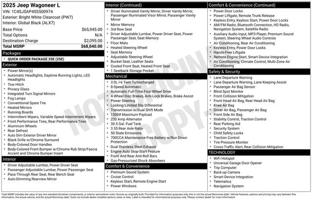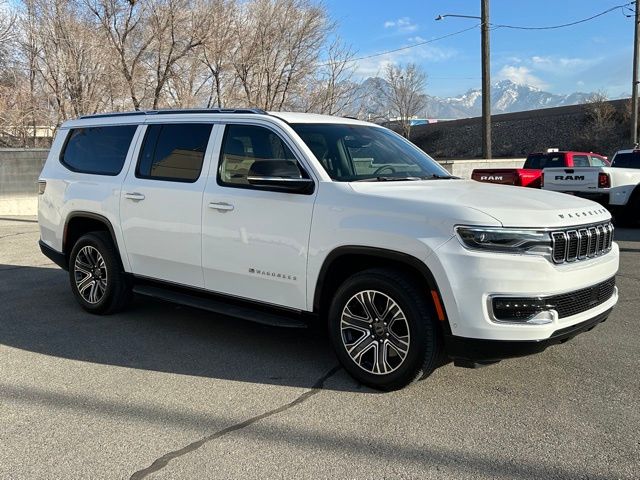Get ready to hit the road in this Jeep Wagoneer L, a standout choice for drivers looking for reliability, performance, and style! This impressive vehicle is packed with premium features designed to make every drive more enjoyable. Plus, youâll enjoy a $1,000 finance savings, already included in the sale price, when you finance through one of our trusted lending partners. Whether youâre searching for used cars in Salt Lake City, a dependable SUV, or a powerful truck, this Jeep Wagoneer L delivers everything you need and more. Visit Salt Lake Valley Chrysler Dodge Jeep Ram today to test drive or explore our entire selection of quality pre-owned vehicles. Donât wait - shop online at www.slvcdjr.com or call 801-484-8755 to learn more! This amazing vehicle comes loaded with options like Quick Order Package 25E, 10 Speakers, 118 MPH Maximum Speed Calibration, 3.55 Rear Axle Ratio, 3rd row seats: bench, 4-Wheel Disc Brakes, ABS brakes, Air Conditioning, Alloy wheels, AM/FM radio: SiriusXM with 360L, Anti-whiplash front head restraints, Apple CarPlay/Android Auto, Audio memory, Auto Adjust In Reverse Exterior Mirrors, Auto-dimming door mirrors, Auto-Dimming Exterior Driver Mirror, Auto-dimming Rear-View mirror, Auto-leveling suspension, Automatic temperature control, Brake assist, Bumpers: body-color, Compass, Delay-off headlights, Driver door bin, Driver vanity mirror, Driver's Seat Mounted Armrest, Dual front impact airbags, Dual front side impact airbags, Electronic Stability Control, Emergency communication system: Jeep Connect, Exterior Mirrors Approach Lamps, Exterior Mirrors w/Memory, Exterior Mirrors w/Supplemental Signals, Four wheel independent suspension, Front anti-roll bar, Front Bucket Seats, Front Center Armrest w/Storage, Front dual zone A/C, Front fog lights, Front License Plate Bracket, Front reading lights, Fully automatic headlights, Garage door transmitter, Heated door mirrors, Heated Exterior Mirrors, Heated front seats, Heated steering wheel, Illuminated entry, Knee airbag, Leather Trimmed Bucket Seats, Low tire pressure warning, Memory seat, Navigation System, Normal Duty Suspension, Occupant sensing airbag, Outside temperature display, Overhead airbag, Overhead console, Panic alarm, ParkView Rear Back-Up Camera, Passenger door bin, Passenger seat mounted armrest, Passenger vanity mirror, Power adjustable front head restraints, Power door mirrors, Power driver seat, Power Liftgate, Power passenger seat, Power steering, Power windows, Radio data system, Radio: Uconnect 5 Nav w/10.1" Display, Rear air conditioning, Rear anti-roll bar, Rear reading lights, Rear seat center armrest, Rear window defroster, Rear window wiper, Reclining 3rd row seat, Remote keyless entry, Security system, Speed control, Speed-sensing steering, Speed-Sensitive Wipers, Split folding rear seat, Steering wheel memory, Steering wheel mounted audio controls, Tachometer, Telescoping steering wheel, Tilt steering wheel, Traction control, Trip computer, Turn signal indicator mirrors, Variably intermittent wipers, Ventilated front seats, Voltmeter, and Wheels: 20" x 9.0" Premium 2 Aluminum, making it the perfect choice for your next adventure.