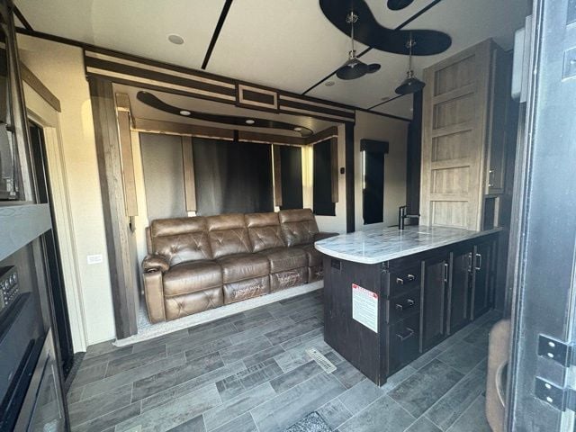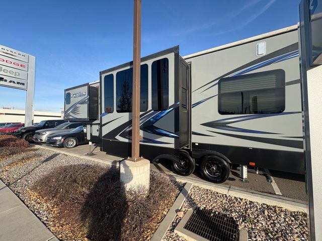 The 2017 Keystone Fuzion 384 is a spacious toy hauler fifth wheel designed for adventure and comfort. This model combines a fully equipped living area with a rear garage for transporting ATVs, motorcycles, or other recreational gear. Inside, the Fuzion offers a full kitchen with stainless steel appliances, solid wood cabinetry, and residential-style furniture including convertible sofas and optional heated seating. The entertainment system features a flat-panel TV, premium stereo, and outdoor speakers. Climate control is handled by dual air conditioning units and a high-capacity furnace, ensuring comfort in any weather. The rear garage doubles as a patio or loading area and includes tie-downs for secure storage of toys. Additional amenities include an outdoor shower, enclosed tanks with heat pads for cold-weather use, and a durable suspension system for safe towing. This fifth wheel can sleep up to nine people, making it ideal for families or groups seeking both adventure and residential-style living on the road.