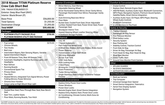 Get ready to hit the road in this Nissan Titan, a standout choice for drivers looking for reliability, performance, and style! This impressive vehicle is packed with premium features designed to make every drive more enjoyable. Plus, youâll enjoy a $1,000 finance savings, already included in the sale price, when you finance through one of our trusted lending partners. Whether youâre searching for used cars in Salt Lake City, a dependable SUV, or a powerful truck, this Nissan Titan delivers everything you need and more. Visit Salt Lake Valley Chrysler Dodge Jeep Ram today to test drive or explore our entire selection of quality pre-owned vehicles. Donât wait - shop online at www.slvcdjr.com or call 801-484-8755 to learn more! This amazing vehicle comes loaded with options like Platinum Reserve Utility Bed Package (5.5' TITAN Box and Rear Bumper Step (B13)), Platinum Utility Package (TITAN Box), 12 Speakers, 2.937 Axle Ratio, 4-Wheel Disc Brakes, ABS brakes, Activation Disclaimer, Air Conditioning, Alloy wheels, AM/FM radio: SiriusXM, Auto tilt-away steering wheel, Auto-dimming door mirrors, Auto-dimming Rear-View mirror, Automatic temperature control, Blind Spot Warning, Brake assist, CD player, Chrome wheels, Compass, Delay-off headlights, Door Sill Kick Plates, Driver door bin, Driver vanity mirror, Dual front impact airbags, Dual front side impact airbags, Electronic Stability Control, Emergency communication system: NissanConnect Services, Floor Mats, Front anti-roll bar, Front Bucket Seats, Front Center Armrest, Front dual zone A/C, Front fog lights, Front reading lights, Front wheel independent suspension, Garage door transmitter: HomeLink, Heated & Cooled Front Captain's Chairs, Heated door mirrors, Heated front seats, Heated rear seats, Heated steering wheel, Illuminated entry, Illuminated running boards, Leather Shift Knob, Leather steering wheel, LED Fog Lights w/Dark Chrome Bezel, Low tire pressure warning, Memory seat, Navigation System, NissanConnect Services Powered By SiriusXM, Occupant sensing airbag, Outside temperature display, Overhead airbag, Overhead console, Panic alarm, Passenger door bin, Passenger vanity mirror, Power door mirrors, Power driver seat, Power passenger seat, Power steering, Power windows, Premium Leather Seat Trim, Radio data system, Radio: NissanConnect w/SiriusXM/Navi & Mobile Apps, Rain sensing wipers, Rear anti-roll bar, Rear seat center armrest, Rear step bumper, Rear window defroster, Remote keyless entry, Running Boards w/Dark Chrome, Security system, Speed control, Speed-sensing steering, Speed-Sensitive Wipers, Split folding rear seat, Steering wheel memory, Steering wheel mounted audio controls, Tachometer, Telescoping steering wheel, Tilt steering wheel, Traction control, Trip computer, Turn signal indicator mirrors, Variably intermittent wipers, Ventilated front seats, Voltmeter, and Wheels: 20" x 8" Dark Chrome Clad, making it the perfect choice for your next adventure.