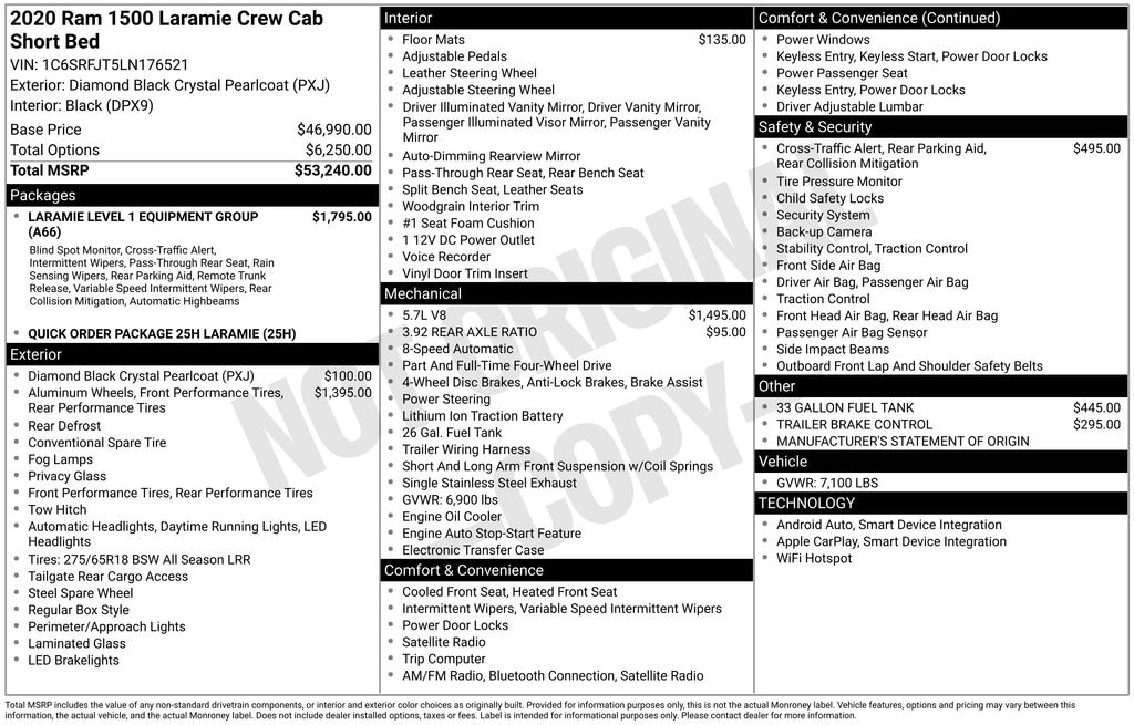 Check out our award winning dealership! 5-star google review, drive a little save a lot. Laramie Level 1 Equipment Group (Auto High Beam Headlamp Control, Blind Spot & Cross Path Detection, Foam Bottle Insert (Door Trim Panel), ParkSense Front/Rear Park Assist w/Stop, Rain Sensitive Windshield Wipers, Rear 60/40 Folding Split Recline Seat, Remote Tailgate Release, and Tailgate Ajar Warning Lamp), Quick Order Package 25H Laramie, Navigation System, #1 Seat Foam Cushion, 10 Speakers, 3 Rear Seat Head Restraints, 3.21 Rear Axle Ratio, 3.92 Rear Axle Ratio, 33 Gallon Fuel Tank, 4 Way Front Headrests, 4-Wheel Disc Brakes, 48V Belt Starter Generator, 8.4" Touchscreen Display, ABS brakes, Adjustable pedals, Air Conditioning, Alloy wheels, AM/FM radio: SiriusXM, Apple CarPlay, Apple CarPlay/Android Auto, Audio memory, Auto-dimming door mirrors, Auto-dimming Rear-View mirror, Automatic temperature control, Brake assist, Bumpers: chrome, Compass, Delay-off headlights, Driver door bin, Driver Seat Memory, Driver vanity mirror, Dual front impact airbags, Dual front side impact airbags, Electronic Stability Control, Front & Rear Rubber Floor Mats, Front anti-roll bar, Front Center Armrest w/Storage, Front dual zone A/C, Front fog lights, Front reading lights, Front Seat Back Map Pockets, Front wheel independent suspension, Fully automatic headlights, Garage door transmitter, Google Android Auto, GPS Antenna Input, Heated door mirrors, Heated Front Seats, Heated front seats, Heated Steering Wheel, Heated steering wheel, Illuminated entry, Integrated Center Stack Radio, Leather steering wheel, Leather Trim 40/20/40 Bench Seat, Low tire pressure warning, Manufacturer's Statement of Origin, Memory seat, Occupant sensing airbag, Outside temperature display, Overhead airbag, Overhead console, Panic alarm, ParkSense Front/Rear Park Assist w/Stop (DISC), ParkView Rear Back-Up Camera, Passenger door bin, Passenger vanity mirror, Pedal memory, Power 4-Way Driver Lumbar Adjust, Power 4-Way Passenger Lumbar Adjust, Power 8-Way Driver & Passenger Seats, Power door mirrors, Power driver seat, Power passenger seat, Power steering, Power windows, Radio data system, Radio: Uconnect 4 w/8.4" Display, Rear anti-roll bar, Rear seat center armrest, Rear step bumper, Rear window defroster, Remote keyless entry, Security system, SiriusXM Satellite Radio, Speed control, Split folding rear seat, Steering wheel mounted audio controls, Tachometer, Telescoping steering wheel, Tilt steering wheel, Traction control, Trailer Brake Control, Trip computer, Turn signal indicator mirrors, Variably intermittent wipers, Ventilated Front Seats, Ventilated front seats, Voltmeter, Wheels: 18" x 8" Aluminum Base Painted, and Wheels: 20" x 9" Premium Paint/Polished Sale Price Includes $1,000 Finance Savings. Contact Dealer For Details.