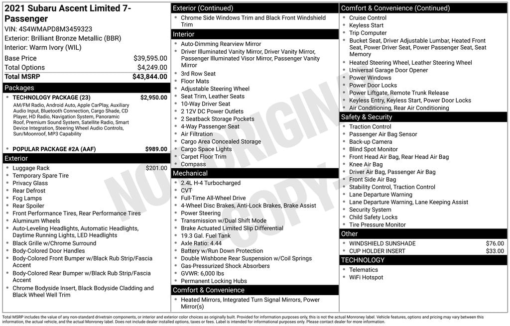 Command attention in this distinctive Brilliant Bronze Metallic Ascent with luxurious Ivory leather interior. The turbocharged 2.4L boxer engine delivers 260 horsepower through Subaru's smooth Lineartronic CVT, while standard Symmetrical All-Wheel Drive provides legendary all-weather capability. With 61,399 miles, this top-tier Limited trim offers heated/ventilated leather seats, panoramic moonroof, Harman Kardon audio, and EyeSight safety suite with adaptive cruise control. The spacious three-row cabin seats up to eight with impressive cargo flexibility. After some time in inventory, this family-focused SUV presents excellent value with Subaru's renowned safety, reliability, and standard AWD confidence.