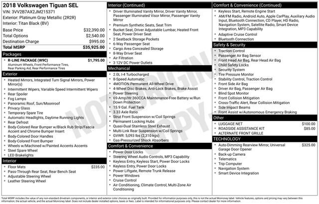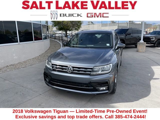 Take your drives to the next level with this Volkswagen Tiguan from Salt Lake Valley Buick GMC! Engineered for a smooth ride, advanced convenience, and lasting dependability, this vehicle is ready to handle everything your day throws at you. Price excludes tax, title, license fee, government fees, and $449 dealer documentary service fee. While every reasonable effort is made to ensure accuracy, we are not responsible for errors or omissions, and vehicles may be sold prior to inquiry please contact the dealer to confirm availability. All financing is subject to approved credit. Looking for quality used cars in Salt Lake City? This Volkswagen Tiguan delivers style, versatility, and value - perfect for daily commutes, family trips, or weekend adventures. Stop by Salt Lake Valley Buick GMC to see this vehicle in person and explore our wide selection of pre-owned cars, trucks, and SUVs. Browse online at www.slvbuickgmc.com or call 801-265-1511 to schedule your test drive today! With R-Line Package (Black Molded Headliner, Park Distance Control (Park Pilot) Front & Rear, R-Line Bumpers, R-Line Front Grille, R-Line Side Sills, R-Line Steering Wheel, Stainless Steel Pedal Cluster & Footrest, and Wheels: 19 Trenton Alloy), 2-Row Rubber Mats Kit, 3.33 Axle Ratio, 4-Wheel Disc Brakes, 6 Speakers, ABS brakes, Air Conditioning, Alloy wheels, Alternate Front Grille, AM/FM radio: SiriusXM, Automatic temperature control, Brake assist, Bumpers: body-color, Compass, Delay-off headlights, Driver door bin, Driver vanity mirror, Dual front impact airbags, Dual front side impact airbags, Electronic Stability Control, Emergency communication system: VW Car-Net, Exterior Parking Camera Rear, Four wheel independent suspension, Frameless Self-Dimming Rearview Mirror w/HomeLink, Front anti-roll bar, Front Bucket Seats, Front Center Armrest, Front dual zone A/C, Front fog lights, Front reading lights, Fully automatic headlights, Heated door mirrors, Heated Front Bucket Seats, Heated front seats, Illuminated entry, Leather Shift Knob, Low tire pressure warning, Luggage Net, Navigation System, Occupant sensing airbag, Outside temperature display, Overhead airbag, Overhead console, Panic alarm, Passenger door bin, Passenger vanity mirror, Perforated V-Tex Leatherette Seating Surfaces, Power door mirrors, Power driver seat, Power Liftgate, Power moonroof, Power steering, Power windows, Radio data system, Radio: AM/FM/HD/CD w/Dual USB Inputs, Rear anti-roll bar, Rear reading lights, Rear seat center armrest, Rear window defroster, Rear window wiper, Remote CD player, Remote keyless entry, Roadside Assistance Kit, Roof rack: rails only, Security system, Speed control, Speed-sensing steering, Split folding rear seat, Spoiler, Steering wheel mounted audio controls, Tachometer, Telescoping steering wheel, Tilt steering wheel, Traction control, Trip computer, Turn signal indicator mirrors, Variably intermittent wipers, and Wheels: 18 Nizza designed for convenience and enjoyment, this Volkswagen Tiguan is ready to take you wherever you want to go.21/27 City/Highway MPGClean CARFAX.Awards:* 2018 KBB.com 10 Best SUVs Under $25,000